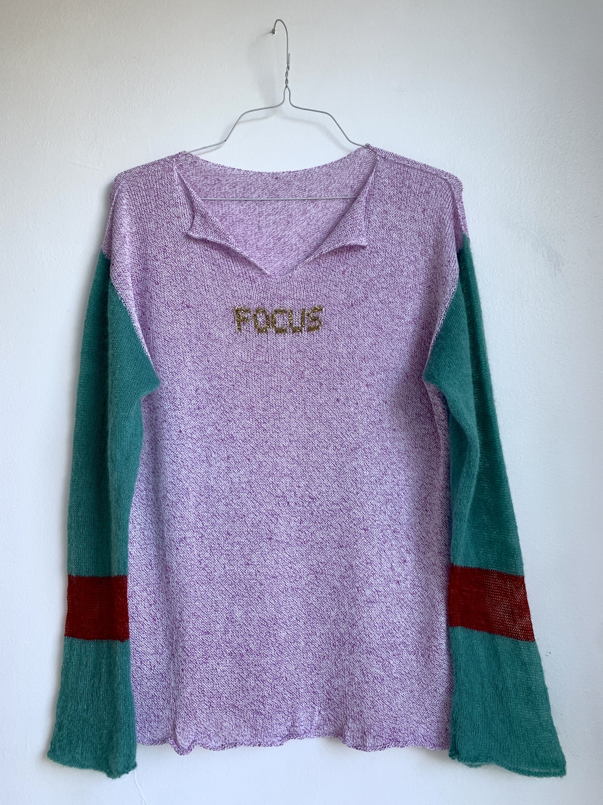Body is a cotton/linen blend, sleeves are mohair/nylon, red stripe is alpaca, gold is polyester/lurex